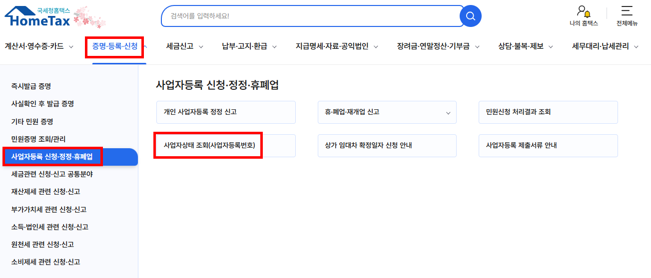 - 홈택스 로그인 → 사업자등록상태 조회 메뉴 이용