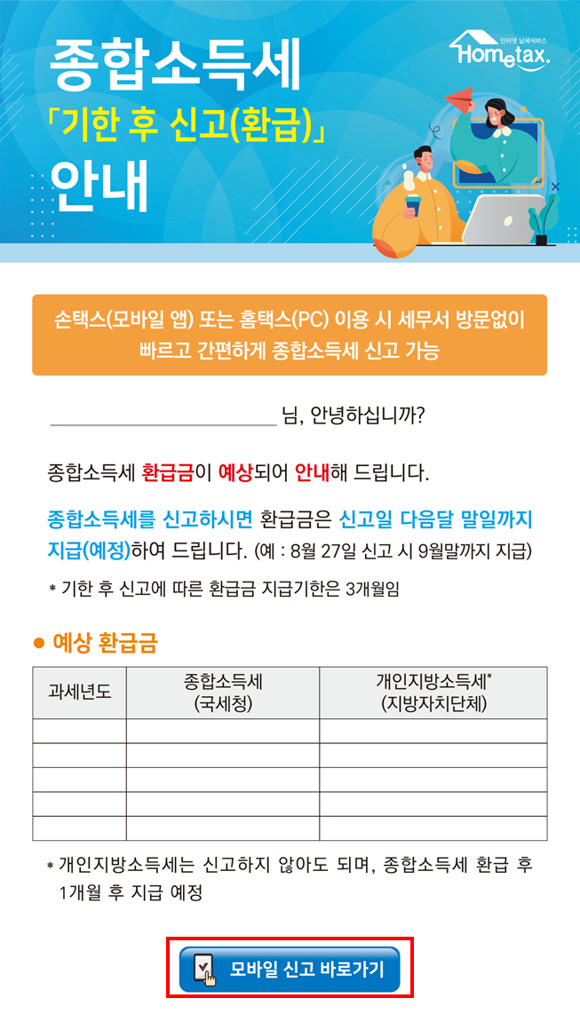 - 국세청은 지난 8월 보낸 안내문을 스팸 문자나 낚시성 광고로 오인하여 환급금을 찾아가지 않은 인적용역 소득자에게 12.4.(수)부터 한 번 더 환급신고를 안내할 예정입니다.