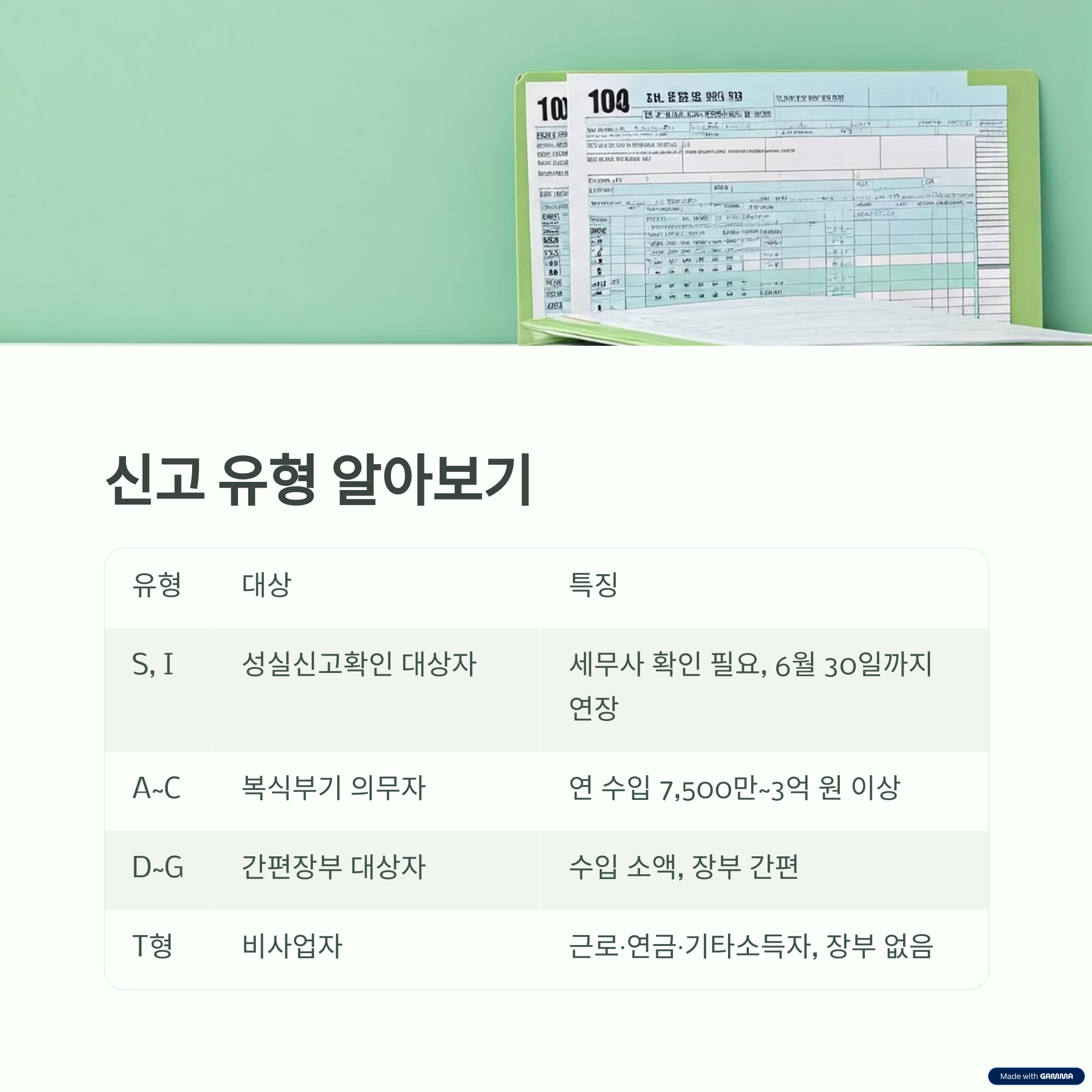 | S, I | 성실신고확인 대상자 | 세무사 확인 필요, 6월 30일까지 연장 |