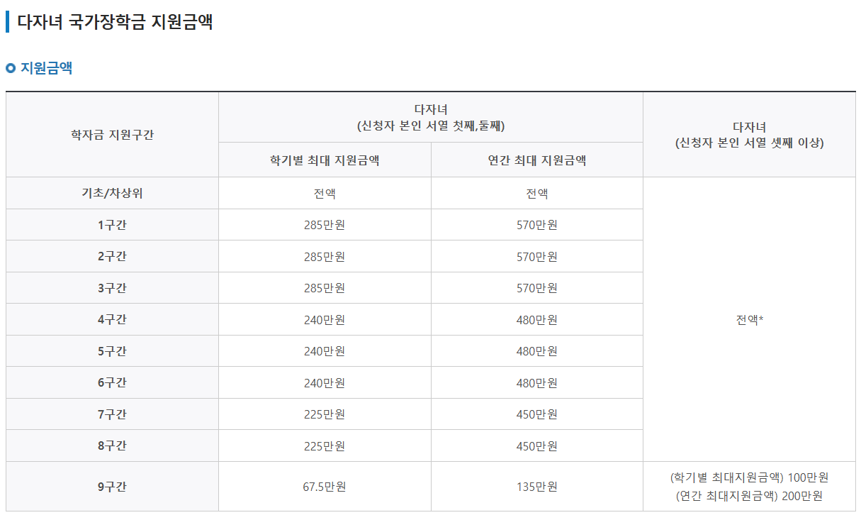 학자금 지원구간다자녀 (첫째·둘째)다자녀 (셋째 이상)학기별 최대 지원금연간 최대 지원금
