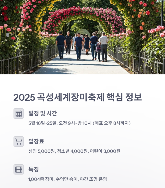 곡성세계장미축제는 2025년 5월 16일(금)부터 5월 25일(일)까지 단 10일간 열립니다.