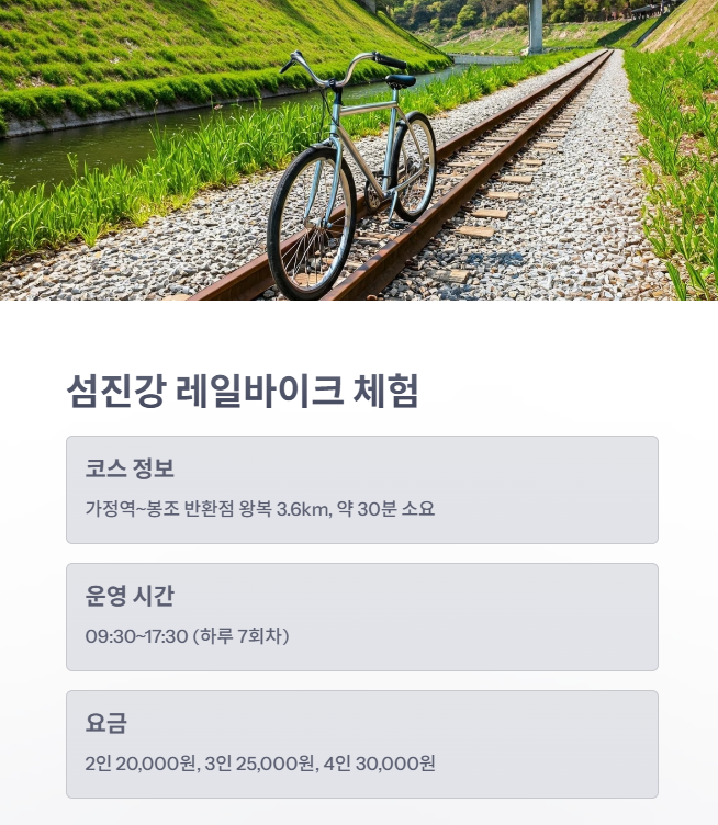 ✔ 오후: 섬진강 레일바이크 탑승 및 기차마을 체험관 둘러보기